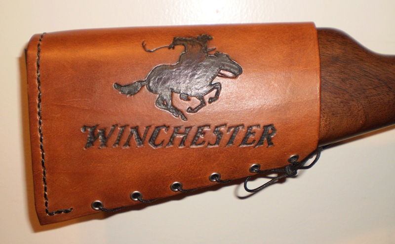 Well, I got it made. Maybe not exactly everything I thought it would be and more, but it's definitely good I think. I tried and tried to make the buttplate cover cap piece. I couldn't do it. I had asked the feller at http://www.levergunleather.com how he makes his. He said he has a form and stretches it I guess. Well, that was virtually impossible for me and I don't have the equipment for it, so I just made mine be on the inside and would only cover most of the buttplate, just not the very top and the very bottom. I didn't think whacking the letters and horse/rider in was too bad. The longest part was figuring out that buttplate cap. Click on the pictures to view them larger. Did I do alright?