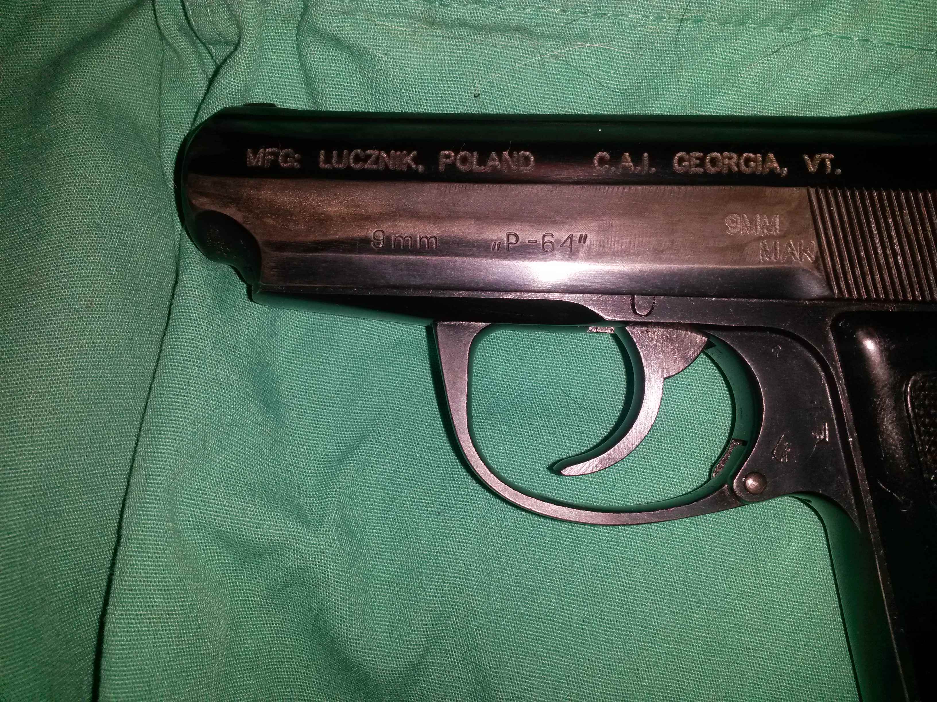 I recently got my P-64 from J&G, and I'm a little curious about something- what was on the left side of the slide that was ground off? Seems like someone took a grinding wheel to mine, I can still see the original 9mm "P 64", but it appears that there was something else above it, along the flat facing. Something that somebody went to a lot of effort to remove. When I look, it sure looks like the entire rest of the slide was erased with a sander, to the point that you almost feel a wave in the metal with your fingertip.