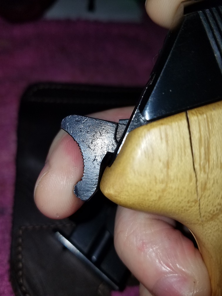 Unfortunately, after taking it out for a test run, the top end of the right-hand panel split. I see immediately what happened. The hammer had been tapping against the tip there on every fire cycle. I had the same issue with the P64 grips he made for me before. Lucky he does replacements for no extra charge.