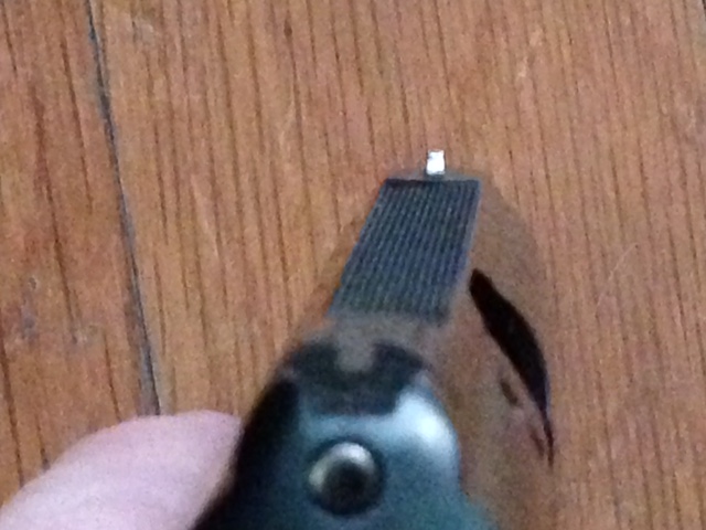 A couple views of the aluminum foil sight. Just applied a bit of epoxy to the sight with a toothpick, laid a piece of foil on the sight and burnished it down, trimmed up with an exact knife. The burnishing (I used one of the wood dowels I use to burnish leather edges) shined up the foil to almost chrome like, easy to find the sight in just about any lighting condition.