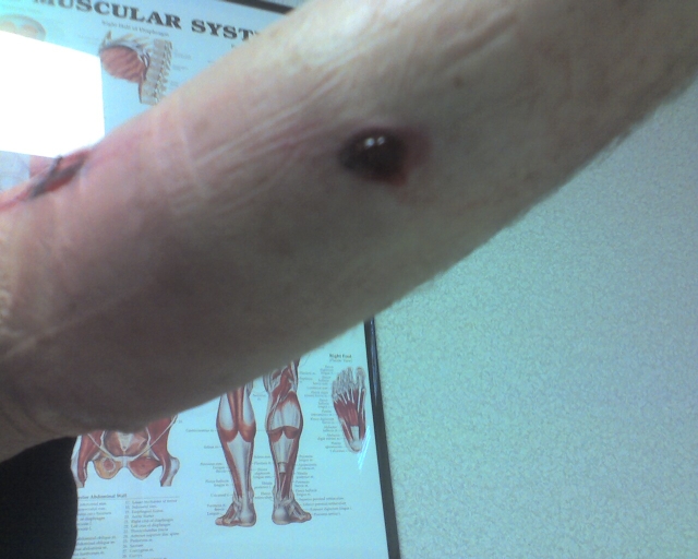 Pictures attached from yesterday at the doctor's office getting the dressing changed ~24 hrs after the shot. You can see where the expanded hollowpoint raked a path up my arm after exiting the muscle.