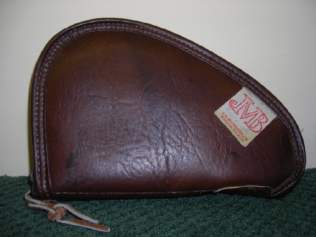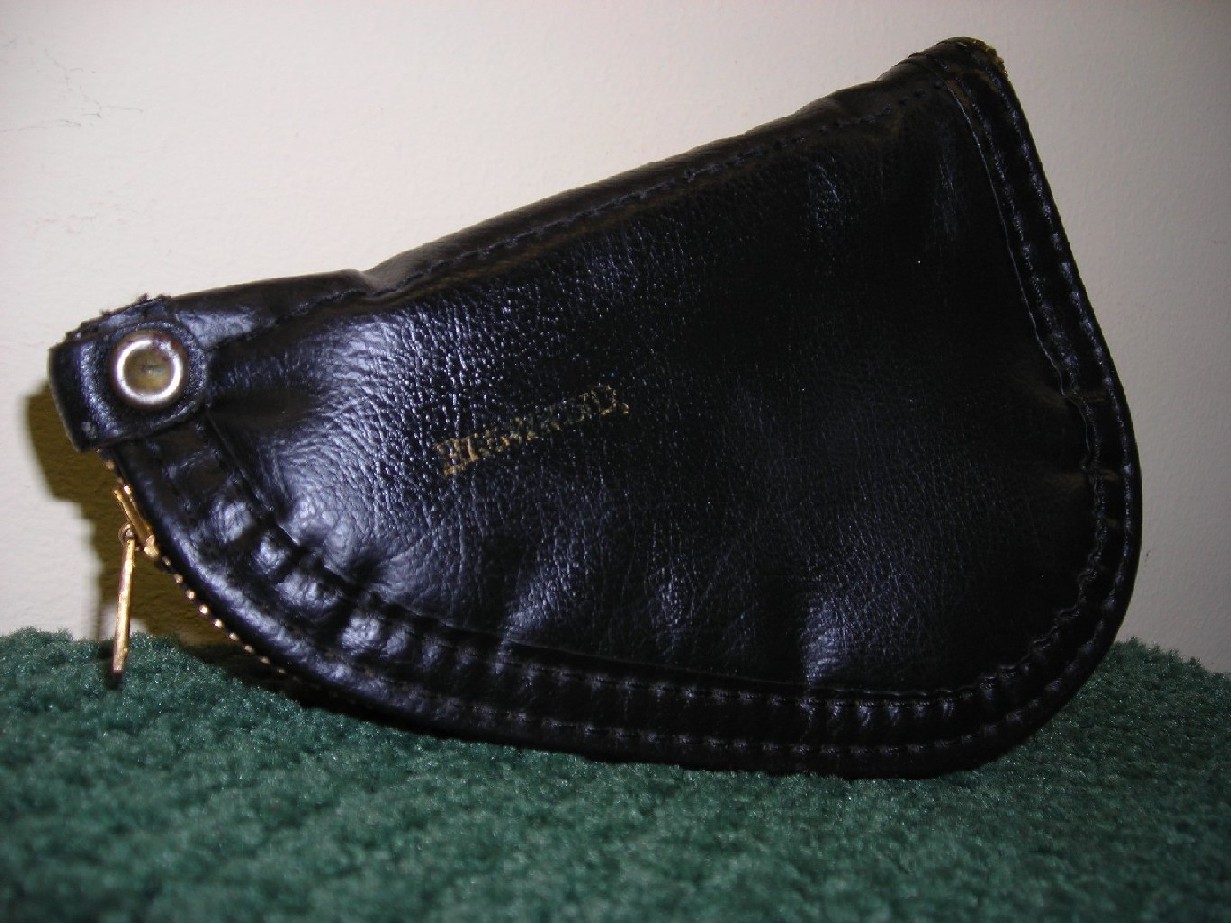 Top pic is after cleaning. About 50% bluing with no deep pits. Not bad for a 1961. I was in a pawn shop out of state over the weekend and was digging through used holster and everything else boxes. A friend of mine always smiles at me for doing this but always joins in too. I almost had a heart attack when I found this and the shop owner said small pouches are $3.00 and large are $5. Got a pouch for the baby and an old J.M.Buchimer Co. pouch that weighs about a pound empty, ultra heavy nauga and sheep or something fur inside. Inside looks like it was never used and on the top above the tag it says "28X". Hard to get something of this quality anymore.