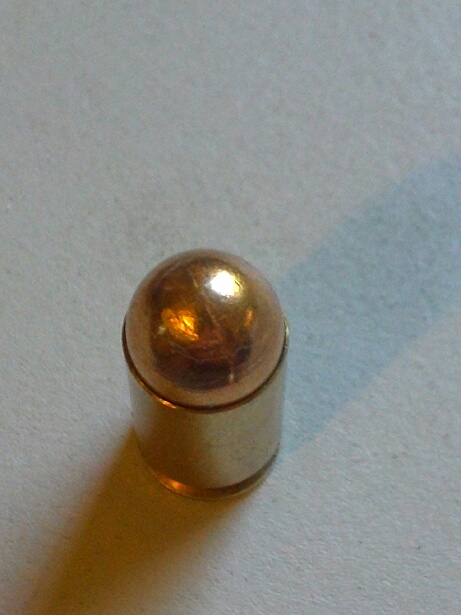 Started loading the magazines with five rounds each, and the issue persists. After the first shot, the second fails to feed. I've got a couple photos here of one of these FTFs. You can see the bullet has a gouge along the center of the nose, makes it look like it was pressed together from two halves, and a dent just to the side of it. There's also a ding on the headstamp (right between the R and E, purty close to the primer, -that- was close!).