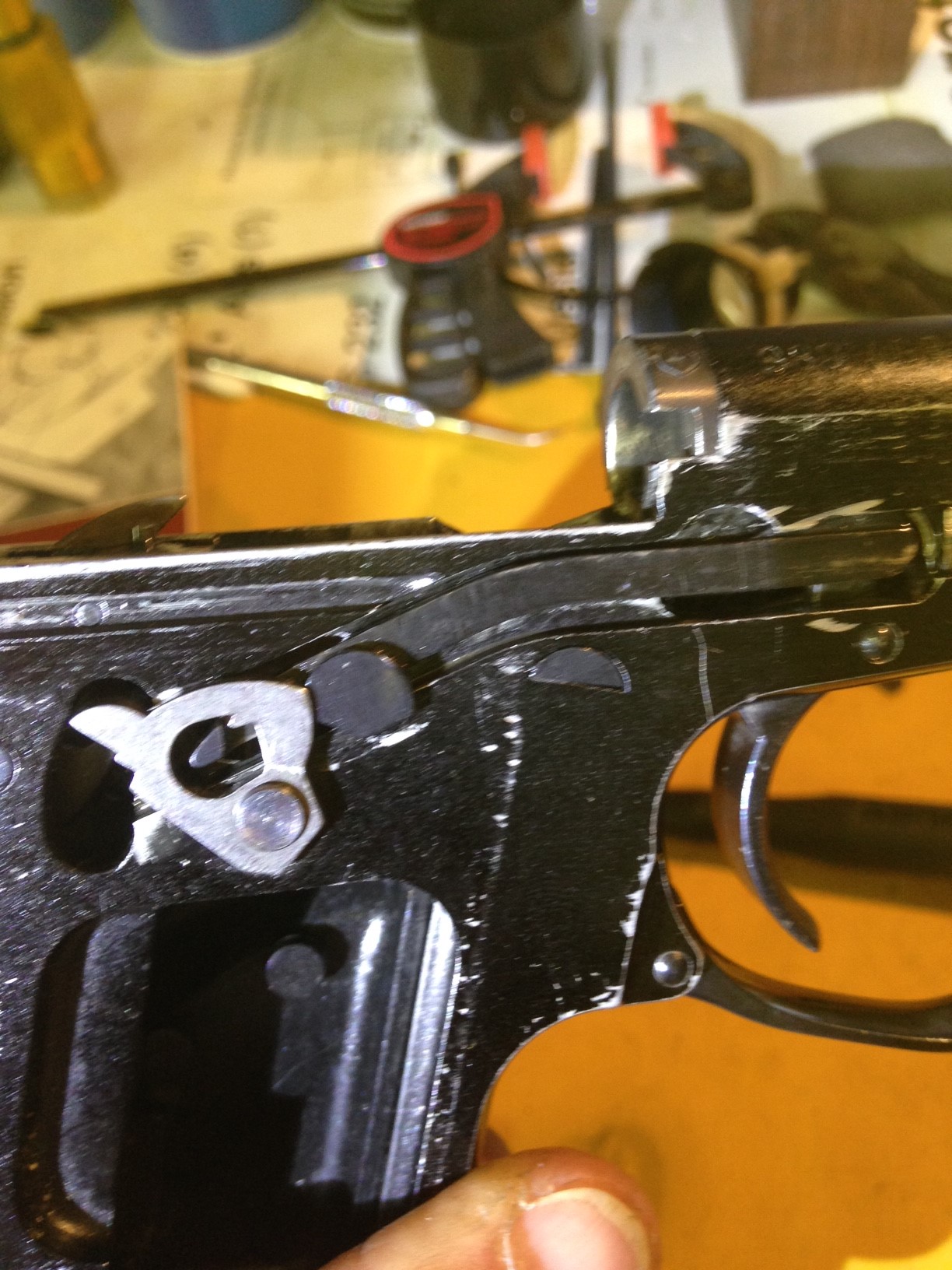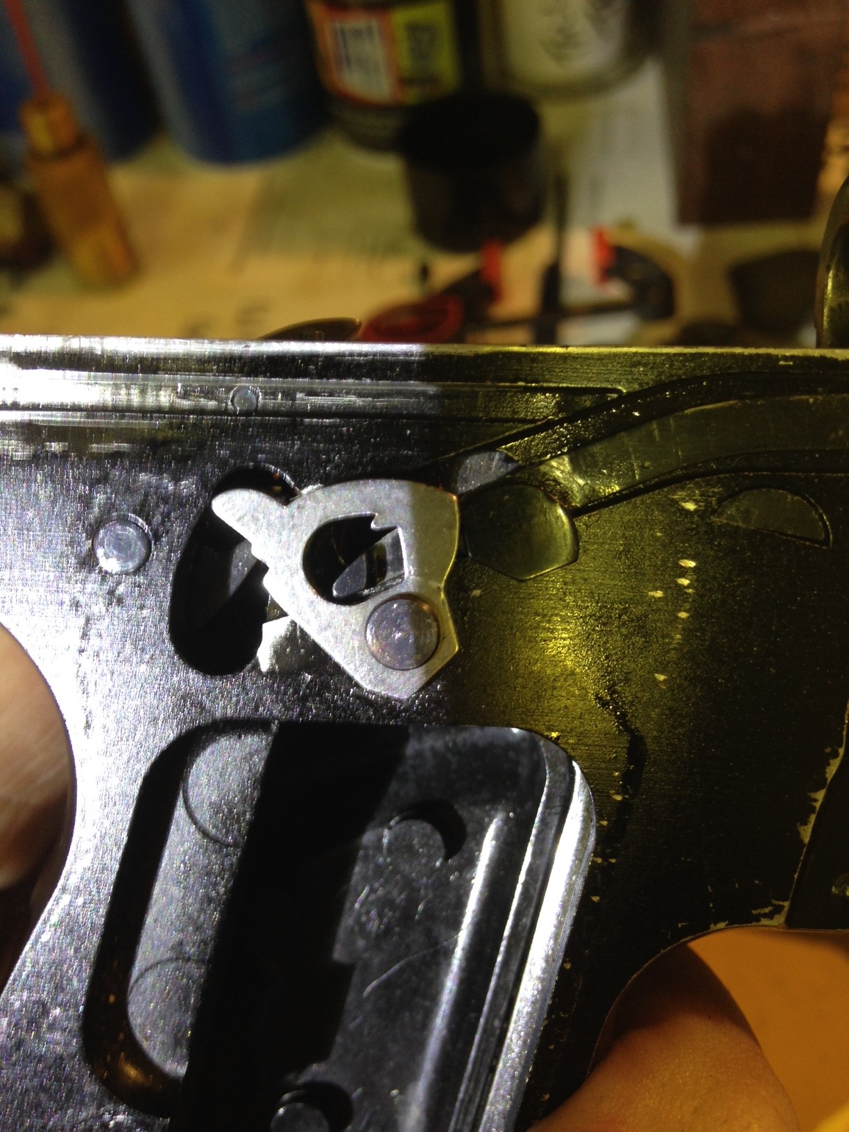 Ok after losing the site on my computer, I am back with pics of my TB and Sear. In one the bar is down and won't release hammer when trigger is pulled and in the other I have positioned it up in it's slot so it will catch sear high lobe and fire the gun. It just defaults to the low position and won't release hammer.