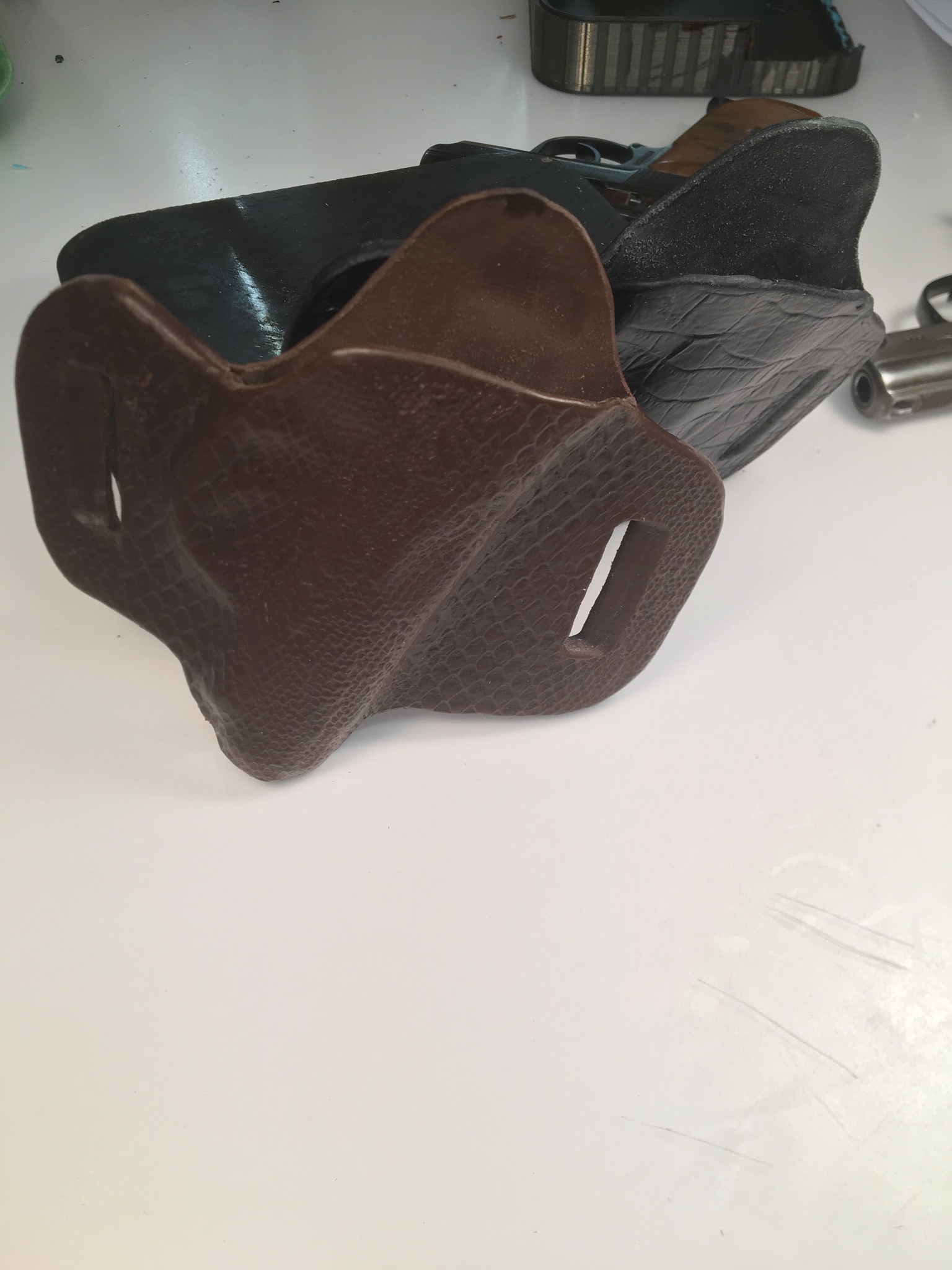 I’ve been working on them awhile to get the process down. And carrying with them for 6 months. I hand make each one in leather then reproduce in the same polyurethane elastomer as my V.05BT grip. Very tough. Better than leather in many respects. Stiff where it needs to be and soft and supple where needed as well. A real,breakthrough in our shop.