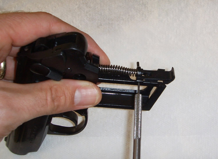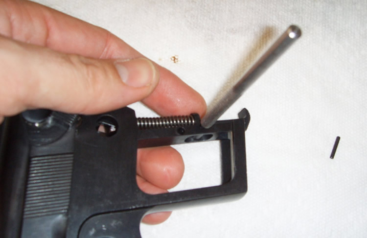 7. Take your 1/16" punch and push that pin out. If you don't have a set of punches, get a set of "Pistol Smith Punches" from MidwayUSA (part #482764) or some such outfit ... they are cheap (11.50 or less) and worth the price!