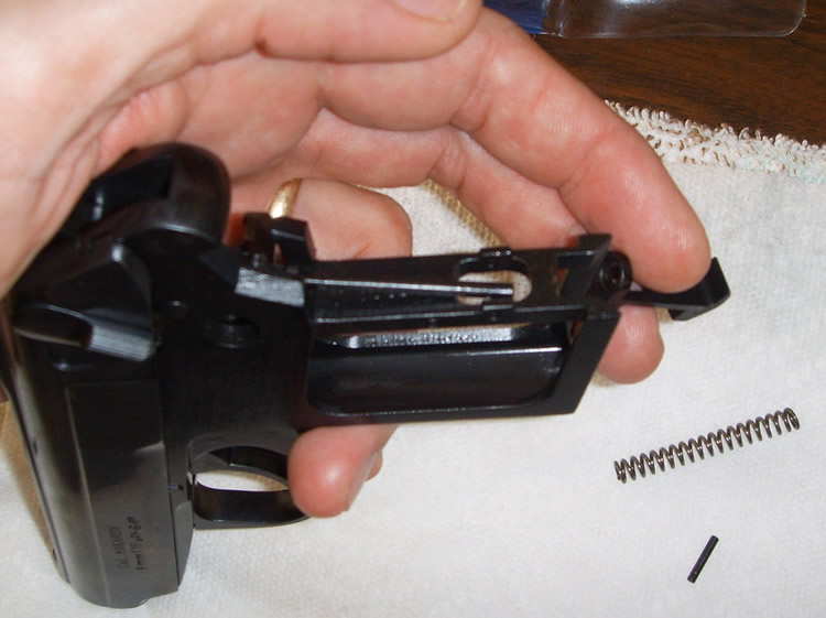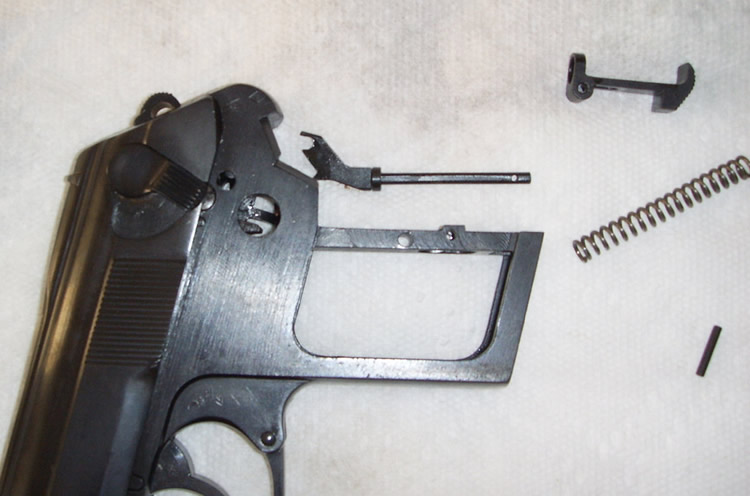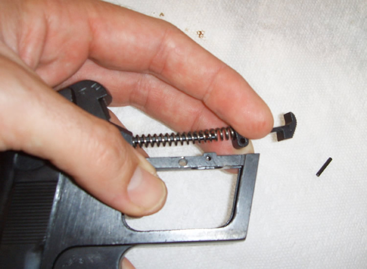9. When the mag release latch comes out, the mainspring will just slide off of its retaining pin.