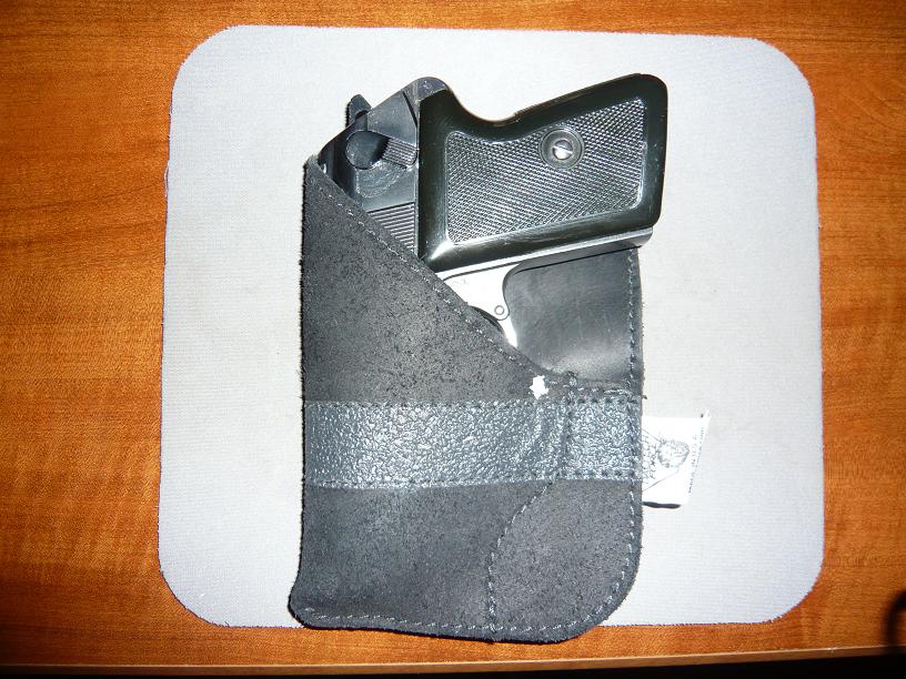 Recently purchased a Daltech Force PP2 pocket holster for my P64. After wearing it for a week I noted that the gun fit the holster in a rather sloppy manner. This holster is designed for the Walther PPK among others of approximately the same size so I figured that the P64 would fit pretty good. After thinking about what to do with the holster I decided that a very simple fix would correct the problem. I stitched two small but very strong stitches three eights of an inch from the original stitching toward the trigger guard and now the gun fits as it should.