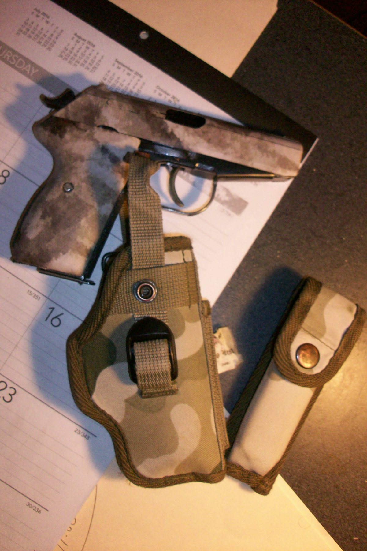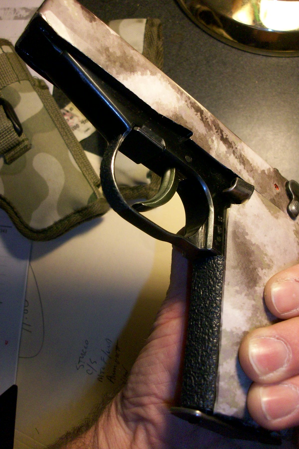 Gun Skins. Yes, I know a bit cheesy and they don't have plain black. Oh, well. I thought I would give it a try. Got the A-Tacs AU in hopes it would be close to the holster. It's not too bad and I love that I can holster and manhandle the P-83 now and not permanently alter it, spend tons of cash on it, and actually protect it from further wear.