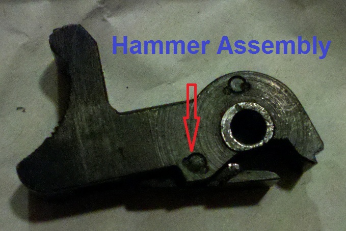 a) In the Manual it calls the part attached to the Hammer the Sear(31) I don't think this is what you replaced as I know that it's pinned in there. So let's agree to call the entire thing (25, 27, 31-33) the Hammer Assembly, as seen in the picture (ignore red arrows in both pics). AGREED