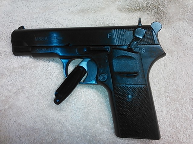 This is the Zestava m88a, 9mm. I bought it from Buds for $216.00 shipped. That includes Buds $10.00 life time warranty. This has become one of my favorite handguns in my collection. Out of the box it's NOT ready to shoot, it need a good cleaning and pretty much all metal to metal surfaces polished up to get it to operate smooth. The fit and finish is actually pretty good, very comfortable in the hand. Has a thumb safety and magazine safety. I happen to believe in safeties so they don't bother me at all. Trigger pull is firm but very smooth and crisp. I've put about 300 rnds through it so far, no malfunctions of any kind. Not as accurate as the p64 but pretty good, mine shoots a tad low, no big deal. I think this is one of the best deals out there for a new Handgun.