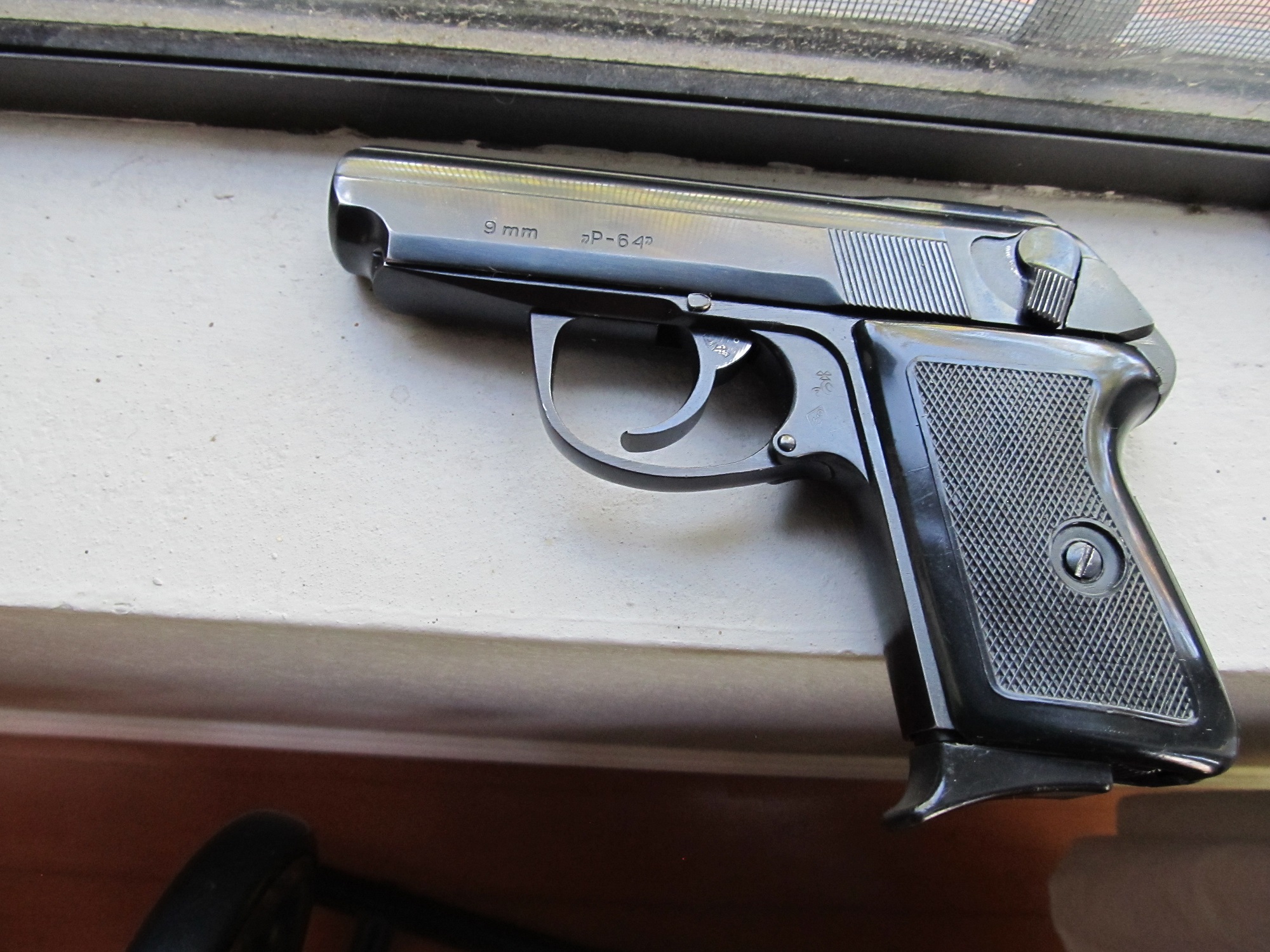 This afternoon I noticed the trigger pin on my 1968 P64 was protruding from the side of the pistol, and is scuffed up (image 9877). Image 0646 is a side view of the pin. Based on a review of photos and records, I was able to determine I took the pistol to the range once in this condition, firing 45 rounds. I have (of course) removed the slide and properly seated the pin (image 0638).