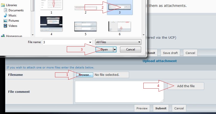 Click on full editer button on the bottom and then use the browse button to go to the pic on your pc.