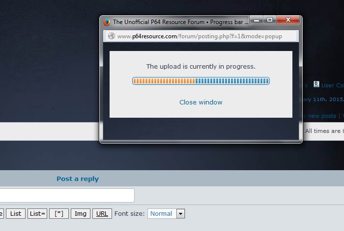 Using the forum method you have to add them as attachments. After you click "Add the file" you should get a progress bar like below. If not your file may be to big, you browser/software out of date, or Apple just sucks and get a PC. Once uploaded you will see them listed in "Posted attachments" well below your post. You will also see them listed just below the post text window in the drop down next the "Attachments:". Put you courser in the text where you want the picture and click the "Place inline" button. Otherwise all the attachments will just show up at the bottom. Your preference. As you can see an outside source shows up cleaner. It may also be easier for you to upload to, with less size restriction. There are many out there that are free. Either way you choose, always remember to use the "Preview" button before posting to make any needed adjustments.