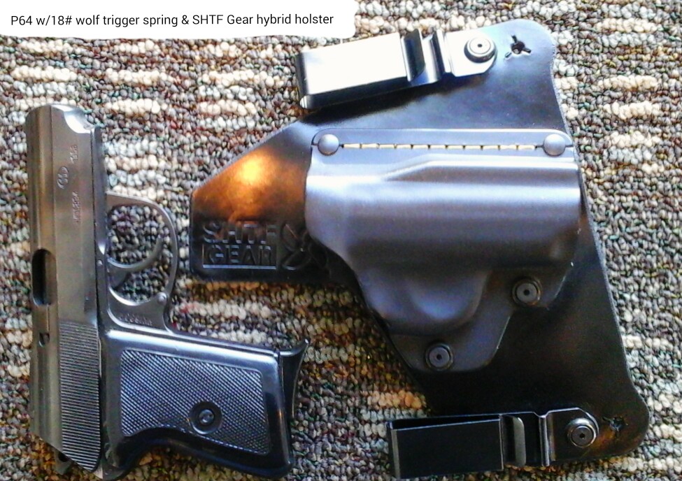So I've found it has been pretty accurate, has eaten hollow point silver bear and Hornady Critical Defense 95gr. FTX Hollow Point well. I like the steel and weight, it comforts me. I like how flat it is. I like the styling, it speaks to me, unlike my glock which is utilitarian but souless. my first order of business was to get a hybrid kydex leather holster for concealed carry. It is my go to type holster, it spreads the weight well on two j clips and a nice well shaped thick leather back plate that helps diminish feeling it's presence and makes it melt into the background of my knowing it's there. And I don't need special belts to keep sag on my pants at the carry position to a minimum. I changed out the spring to reduce the double action trigger pull which Was terribly heavy. The wolf spring did it's job well and now I can stay on target with first shot and it's now a completely serviceable trigger. Ammunitiontogo.com for the critical D, amazon for the storefront of SHTF Gear for the hybrid holster made specifically for the p64 and they are American made family owned small biz. and wolf for the 3 pack of springs of which I picked the 18#. The p64 is from aim, it was a hand pick and when I received it I could find no finish wear, and no evidence of having been fired, it must have sat in a box in some polish military armory on a shelf forgotten for the last 40 years.